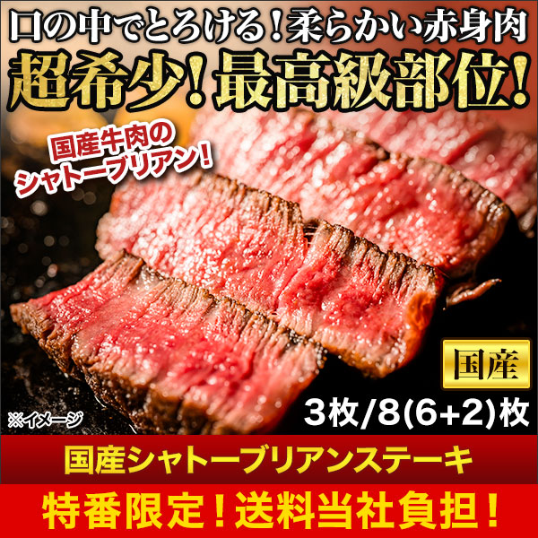 | 商品説明 | 超希少!最高級部位のシャトーブリアン! 国産牛肉だから臭みがなく、口の中でとろけるような柔らかい赤身が絶品! 飲食店やホテルでも採用実績あり! シャトーブリアンは牛ヒレ肉の中でも中央の最も厚い部分。 牛1頭からわずか2kgしかとれない大変希少な部位です! |
