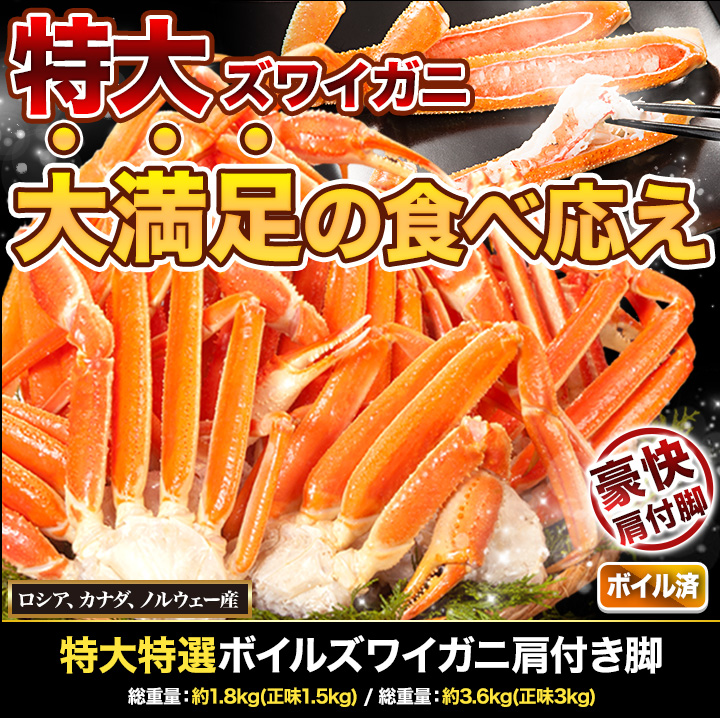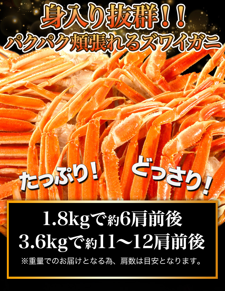 | 商品説明 | 1肩分でボリューム満点!特に大きい脚をセレクトしたズワイガニの肩付脚をどっさりお届け! どーんと太くてすごいボリュームの脚!プリップリのズワイガニを そのまま急速冷凍! 獲れたての新鮮な旨みをギュ-ッと閉じ込めてお届け致します。 身詰まり・身離れも抜群!身ばなれが良いのは、鮮度がいい証拠! 繊維質に富んだ甘い身も絶品です。 甲羅なしの美味しい肩付き脚部分だけのセットで大変お買得! ほおばれば極上の旨味が溢れ出す! 大定番の美味しい特選ズワイガニをお腹いっぱいどうぞ! |