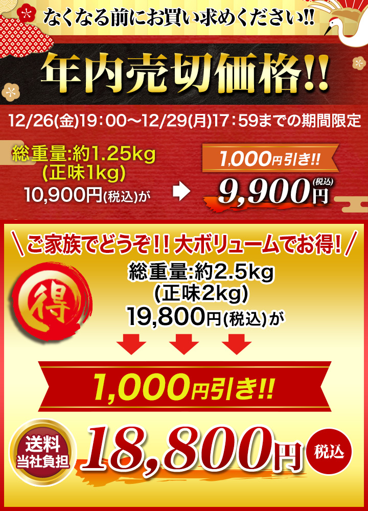 | セット内容 | 総重量:約1.25kg(正味1kg) 【棒肉/ハーフポーション】約3~5本前後 【爪・爪下/センターカット】約2~4本前後 【肩肉/センターカット】約3~6枚前後 【南蛮/サイドスリット】約3~5本前後 総重量:約2.5kg(正味2kg) 【棒肉/ハーフポーション】約6~10本前後 【爪・爪下/センターカット】約4~8本前後 【肩肉/センターカット】約6~12枚前後 【南蛮/サイドスリット】約6~10本前後 ※1肩サイズ:約350g~500g前後 ※重量でのお届けとなる為、本数、枚数は前後いたします。 |