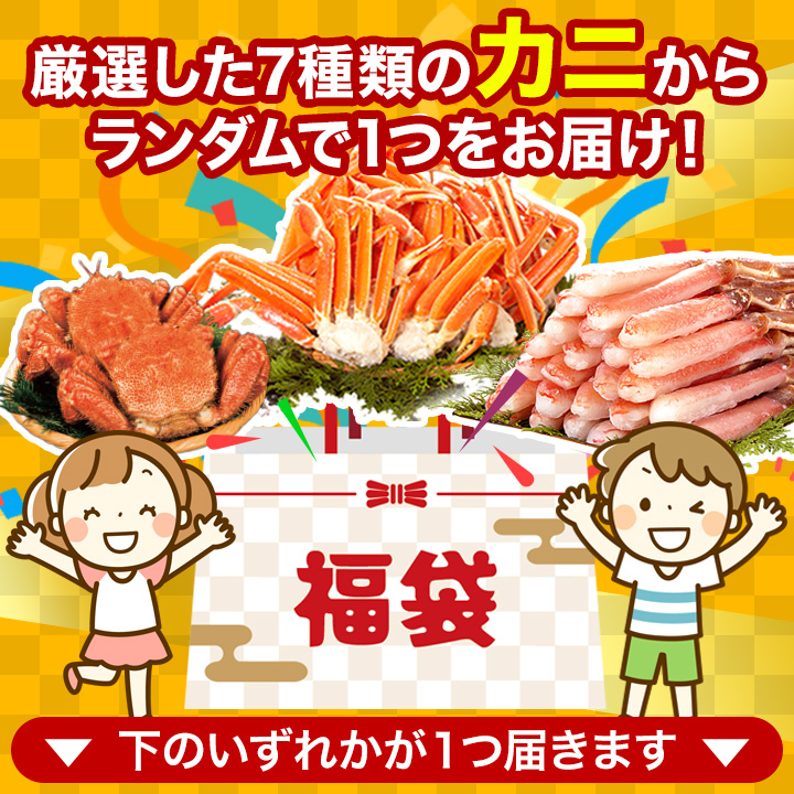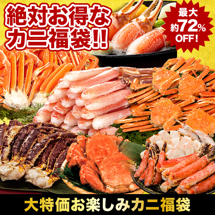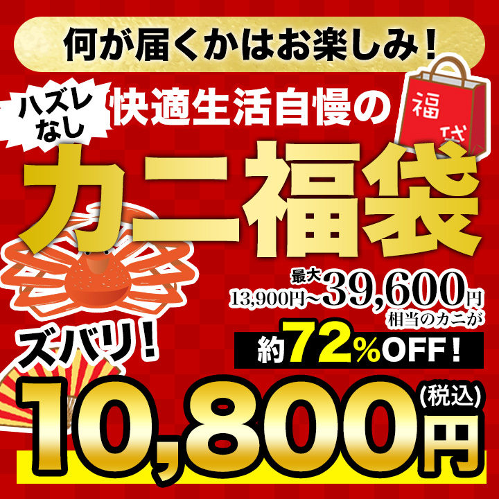 | 商品説明 | 快適生活自慢のカニが入った福袋! 厳選した7種類のカニから1つをお届けします。 何が当たってもお買い得♪最大で39,600円のカニが約72%OFFの10,800円! |