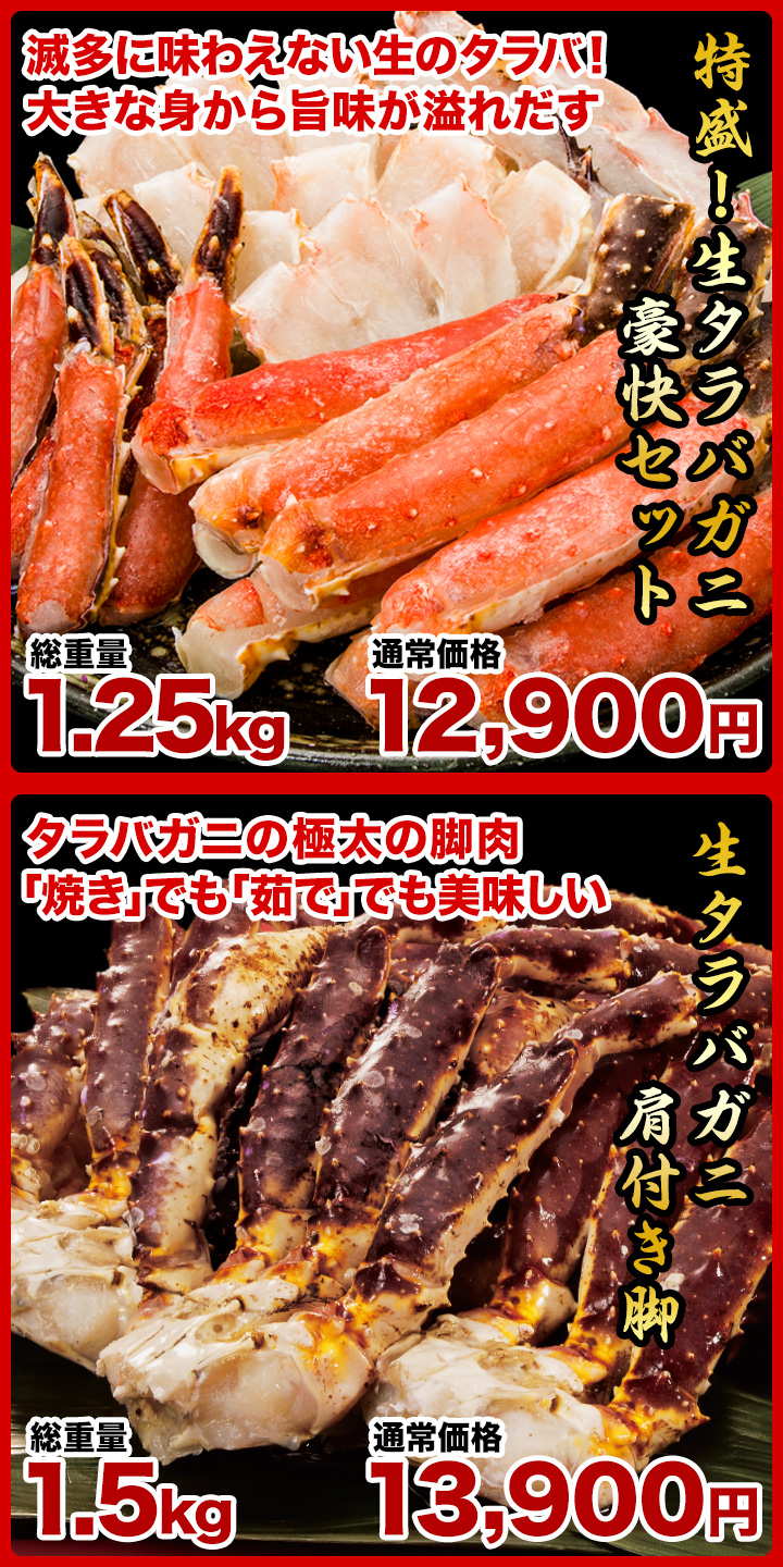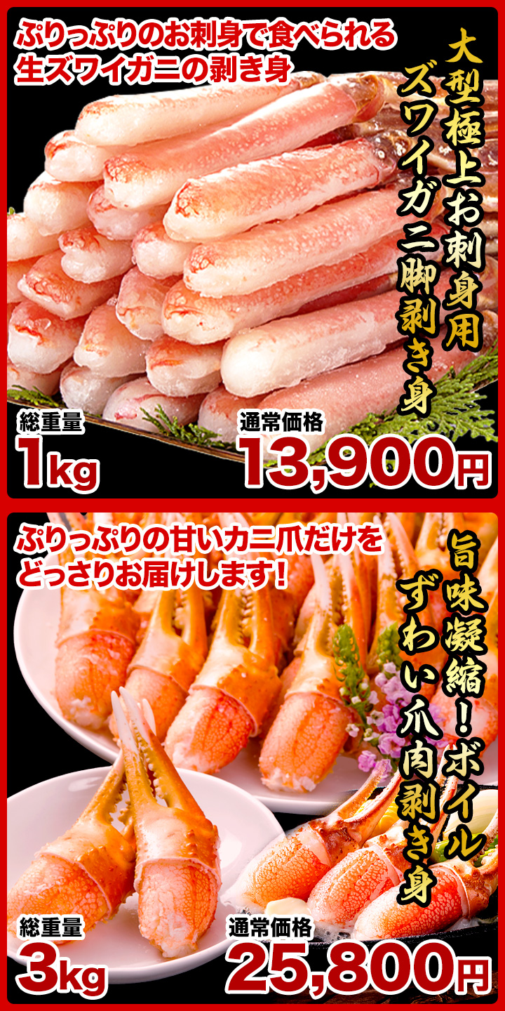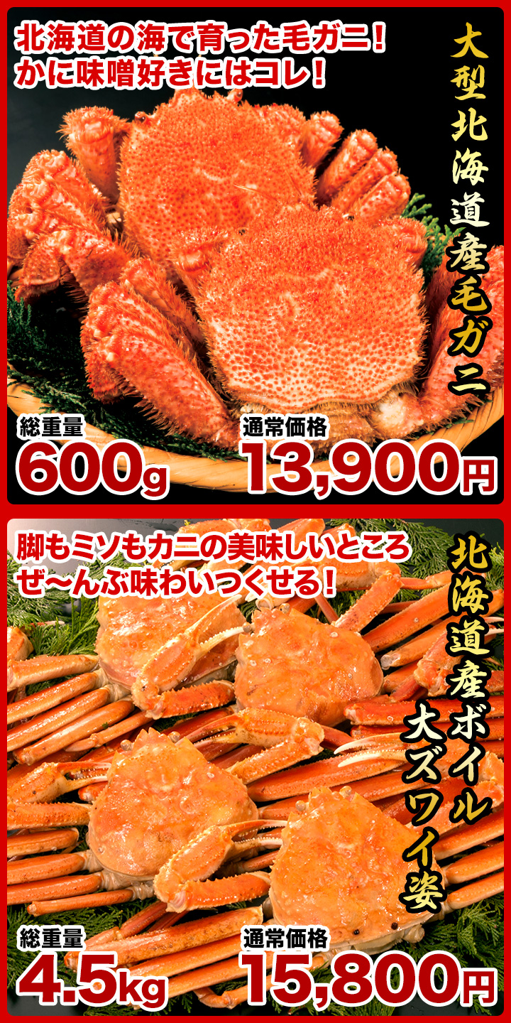 | 原料原産地 | 1.特選ボイルズワイガニ肩付き脚:ロシア、カナダ、ノルウェー 2.特盛!生タラバガニ豪快セット:ノルウェー 3.生タラバガニ肩付脚:ノルウェー 4.大型北海道産毛ガニ:北海道 5.北海道産ボイル大ズワイ姿:北海道 6.大型極上お刺身用ズワイガニ脚剥き身:カナダ、ロシア 7.ボイルずわい爪肉剥き身: ロシア、ノルウェー |