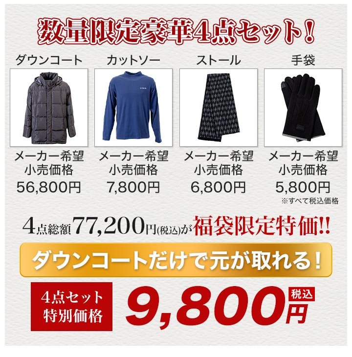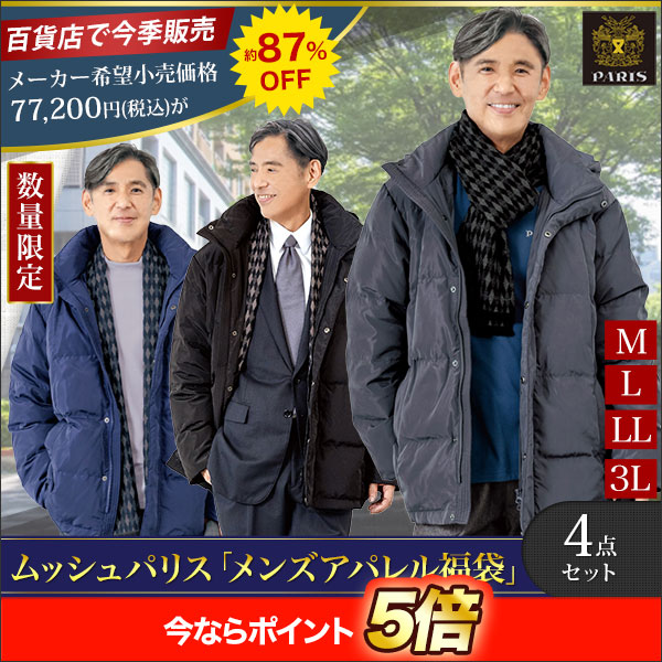 | 商品説明 | MONSIEUR PARIS(ムッシュ パリス)ブランドの福袋です。 カジュアルでもビジネスにも使える撥水加工のダウンコート、どんなファッションにも合わせやすいカットソー、ベーシックカラーでおしゃれなチェック柄のマフラー、シンプルなカラー・デザインの手袋の4点セットです。 メーカー希望小売価格総額77,200円(税込)の4点セットを約87%OFFの大特価でお届けします。 |