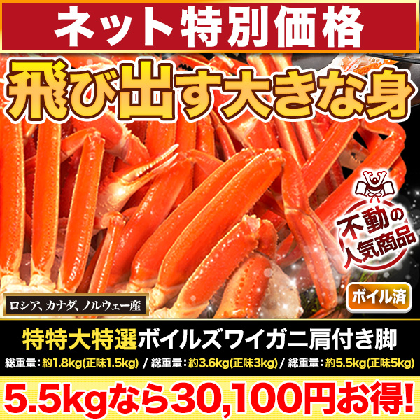【ネット特別価格】特特大特選ボイルズワイガニ肩付き脚 総重量:約1.8kg(正味:1.5kg)/総重量:約3.6kg(正味:3kg)/総重量:約5.5kg(正味:5kg)