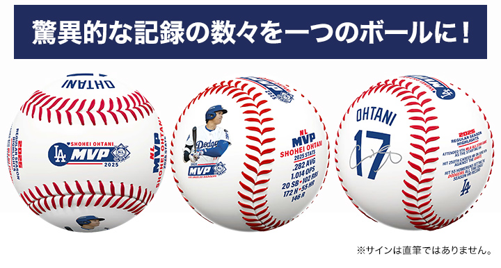打席での鬼気迫るフォトやサインに加え、2025年シーズンの驚異的なスタッツ、通算250号本塁打やオールスター出場の輝かしい節目などの栄光が詳細にプリントされたボール。
