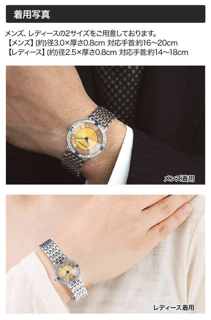 | サイズ(約) | 【メンズ】ケース(約) 径3.0×厚さ0.8cm、対応手首:約16~20cm 【レディース】ケース(約) 径2.5×厚み0.8cm、対応手首:約14~18cm |