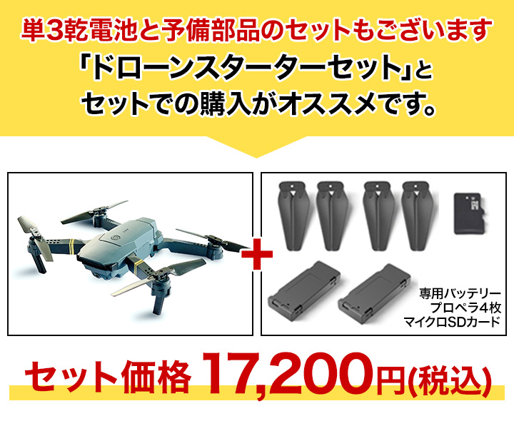 | セット内容 | 本体、コントローラー、バッテリー、プロペラガード×4、バッテリー用ケーブル、コントローラー充電ケーブル、専用ケース、本体取説、カメラ接続説明 |