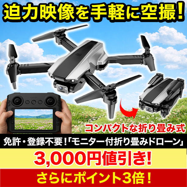 | 商品説明 | カメラ搭載! ボタン一つでラクラク! 高画質撮影が楽しめる最新ドローンです。 コンパクトな折り畳み式で、持ち運びに便利な専用ケース付き! スマホ接続不要!パソコンもなしで操作も映像チェックもリモコンでできるので、初心者の方でもお気軽にご使用いただけます。 |