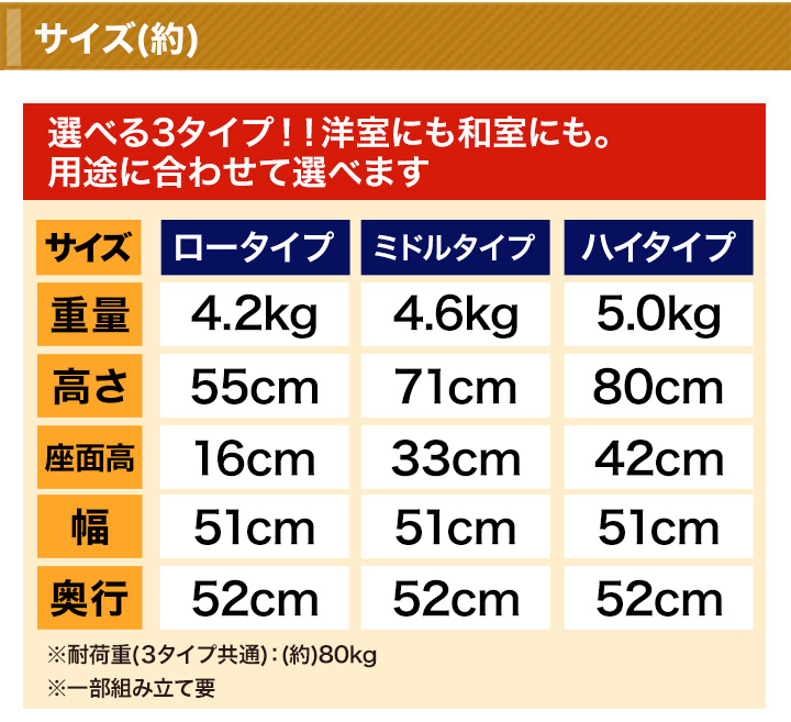 | サイズ・重量・耐荷重(約) | 【サイズ】幅51cm×奥行52cm(3タイプ共通) ロータイプ:高さ55cm(座面高16cm)、重量:4.2kg ミドルタイプ:高さ71cm(座面高33cm)、重量:4.6kg ハイタイプ:高さ80cm(座面高42cm)、重量:5.0kg 【耐荷重】(約)80kg |