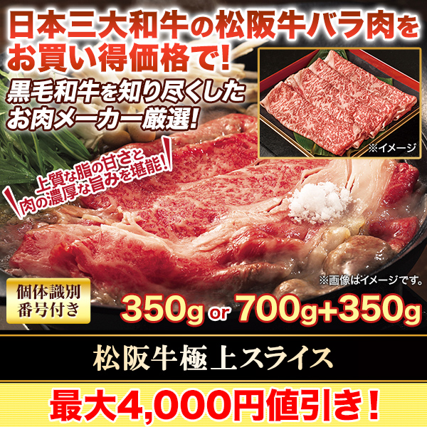 | 商品説明 | 極上の柔らかさと旨みを兼ね備えた日本三大和牛・松阪牛! 1頭1頭手塩にかけて育てられた未経産の雌牛に限定! 脂の甘さと肉質の濃厚な旨みが融合し、甘く上品に広がる香りとなめらかな食感をご堪能いただけます。 肉質4等級以上が厳選された極上スライスは、すき焼きやしゃぶしゃぶに最適! 黒毛和牛を知り尽くした職人厳選の逸品!個体識別番号付きで安心してお召し上がりいただけます。 |
