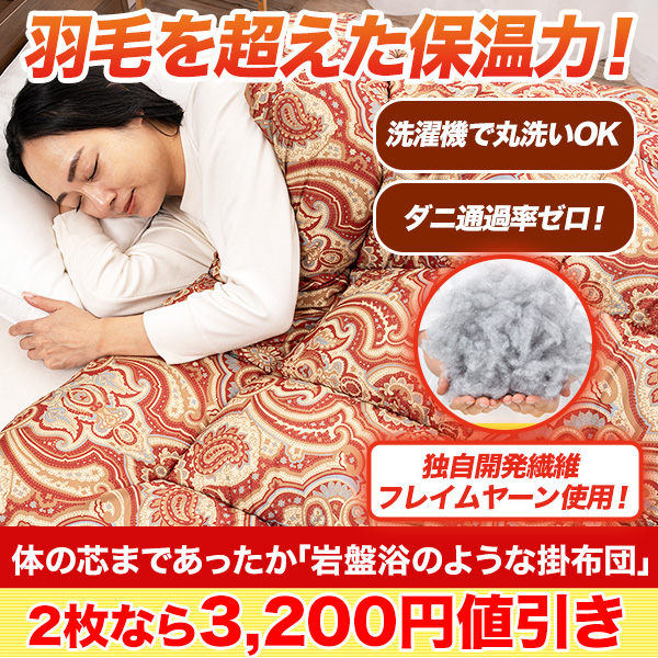 | 商品説明 | 羽毛を超えた保温力!体の芯まであったか!まるで岩盤浴のような掛布団です。 独自開発の天然鉱石配合繊維「FLAME YARN(フレイム ヤーン)」を使用。 同繊維を使用した生地と、使用していない生地との蓄熱試験の比較検証では、10分後に11.2℃もの温度差がみられました。 体が芯からあたたまり、寒い冬でも他の熱源を使わずに快適な睡眠を得ることができます。 蓄熱性に優れ岩盤浴にも使われている天然鉱石繊維と、高反発でへたりにくく耐久性に優れたダクロンΩ捲縮繊維を配合! 耐久性の高い中わたを使用しているので、洗濯機で丸洗いが可能! 洗濯後もへたりにくく弾力が戻ります! |