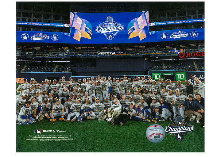 2024年の衝撃から1年、2025年もまたドジャースが世界を制しました。優勝直後に歓喜の輪を作るチーム集合写真を捉えた永久保存版MLB公式フォト。