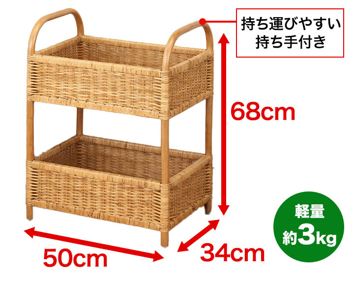 | 商品説明 | リビング、キッチン、洗面所様々な場所に使える2段式ラック。 天然素材ならではのナチュラルさで和洋室問わずお使いいただけて、お部屋に圧迫感をあたえず やさしさを演出してくれる籐製のラックです。 夏には涼やかさを、冬には暖かみを感じさせてくれる籐は、一年を通してお使い頂ける人気の素材です。 |
