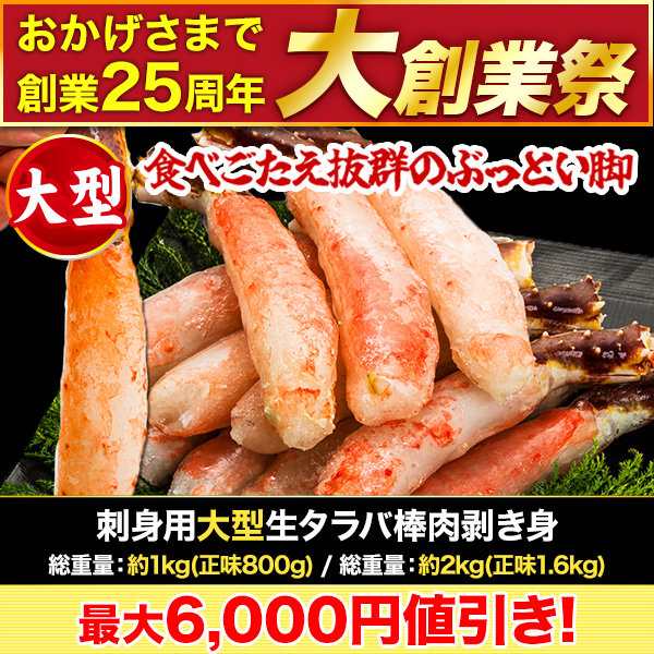 | 商品説明 | 目を見張るほどの分厚いサイズと弾力のあるプリップリの身が自慢のタラバを「生」でご用意しました。 新鮮だから旨味が違う!生だから甘みが違う! 召し上がり方は自由自在。鮮度と品質に自信がある生タラバです。新鮮だからお刺身でもOK! |