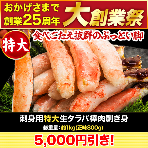 【大創業祭】刺身用特大生タラバ棒肉剥き身 総重量:約1kg(正味800g)