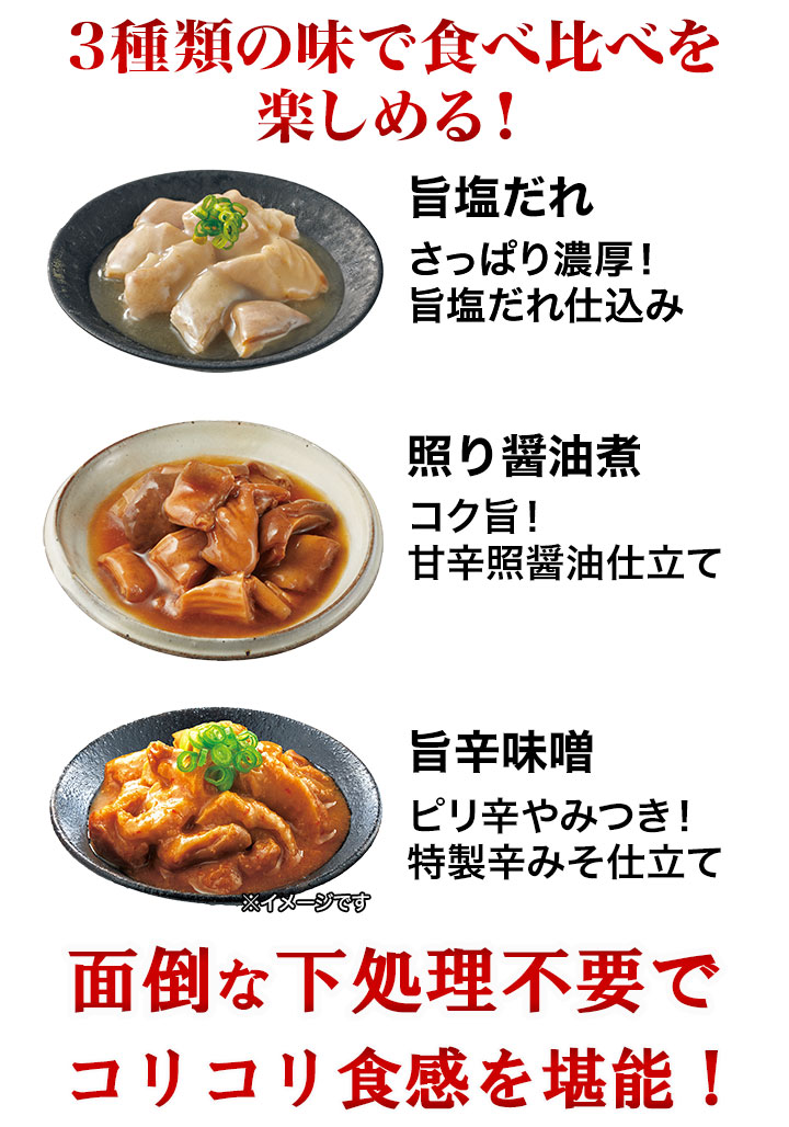 コク旨の照り醤油煮、さっぱり濃厚な旨塩だれ、ピリ辛やみつきな辛味噌煮の3種類の味をご用意!ごはんやお酒がすすむ美味しさです。