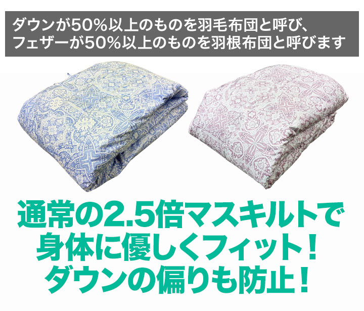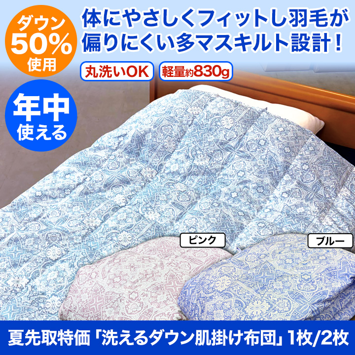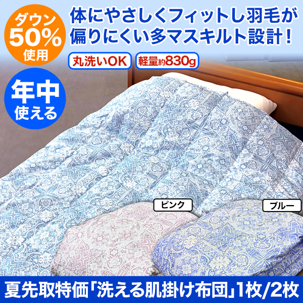 | 商品説明 | ふんわり軽くてやわらかい、年中使えるダウン肌掛け布団が限定特価! ダウン50%とフェザー50%で、保温性と通気性をバランスよく実現。 吸湿・放湿性に優れ、蒸れにくくさらっと快適な寝心地です。 夏は1枚で涼しく、春秋はそのまま、冬は重ね使いであたたかく活躍。 ダウンの特性により、季節に応じて温度を自然に調節してくれます。 ふんわり軽量設計で、寝苦しさを軽減しぐっすり快眠。 2.5倍の細かいマスキルトで体にフィットし、羽毛の偏りも防止。 ご家庭の洗濯機で丸洗いできるので、お手入れも簡単&清潔。 創業70年以上の老舗メーカー品質で安心の使い心地。 今だけ数量限定!2枚購入でさらにお得な特別価格です。 |