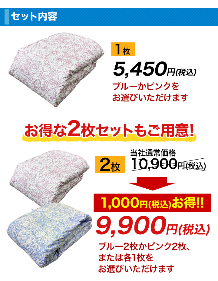| 商品番号 | 【1枚:ブルー】14633 【1枚:ピンク】14634 【2枚:ブルー】14635 【2枚:ピンク】14636 【2枚:各1枚】14637 |