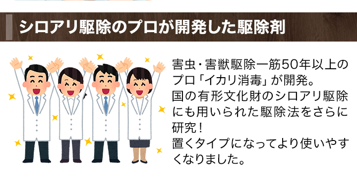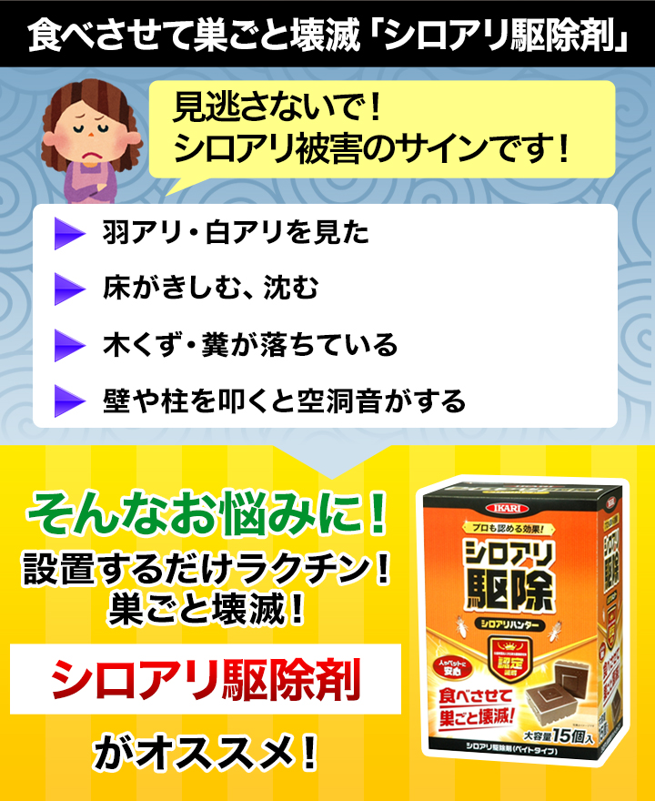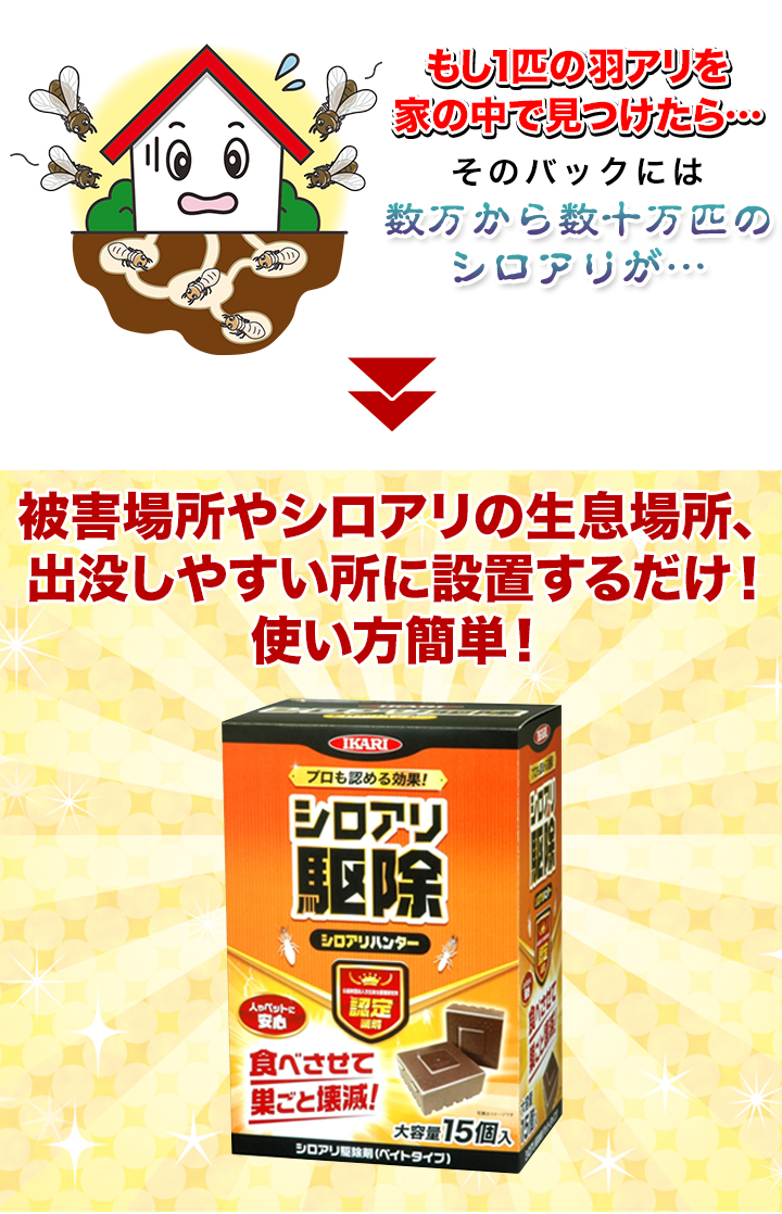 | 商品説明 | シロアリ被害を根本解決!持続効果最大2年! 被害場所やシロアリの生息場所、出没しやすい所に設置するだけ! |