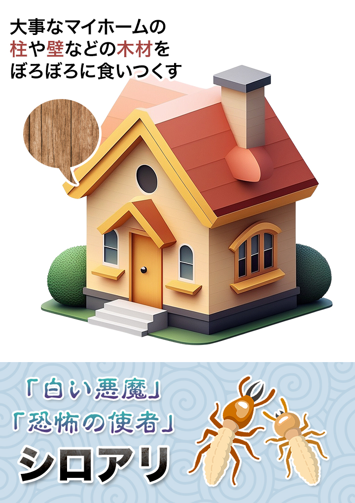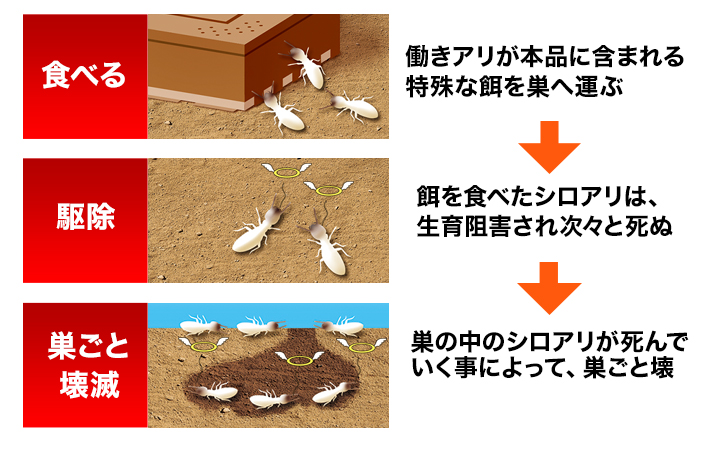 殺虫スプレーなどで目に見えるシロアリを退治しても、巣が残っている限り被害は止まらない! 本品は巣ごと壊滅でき、納得の駆除効果!