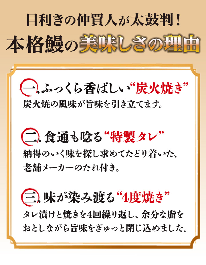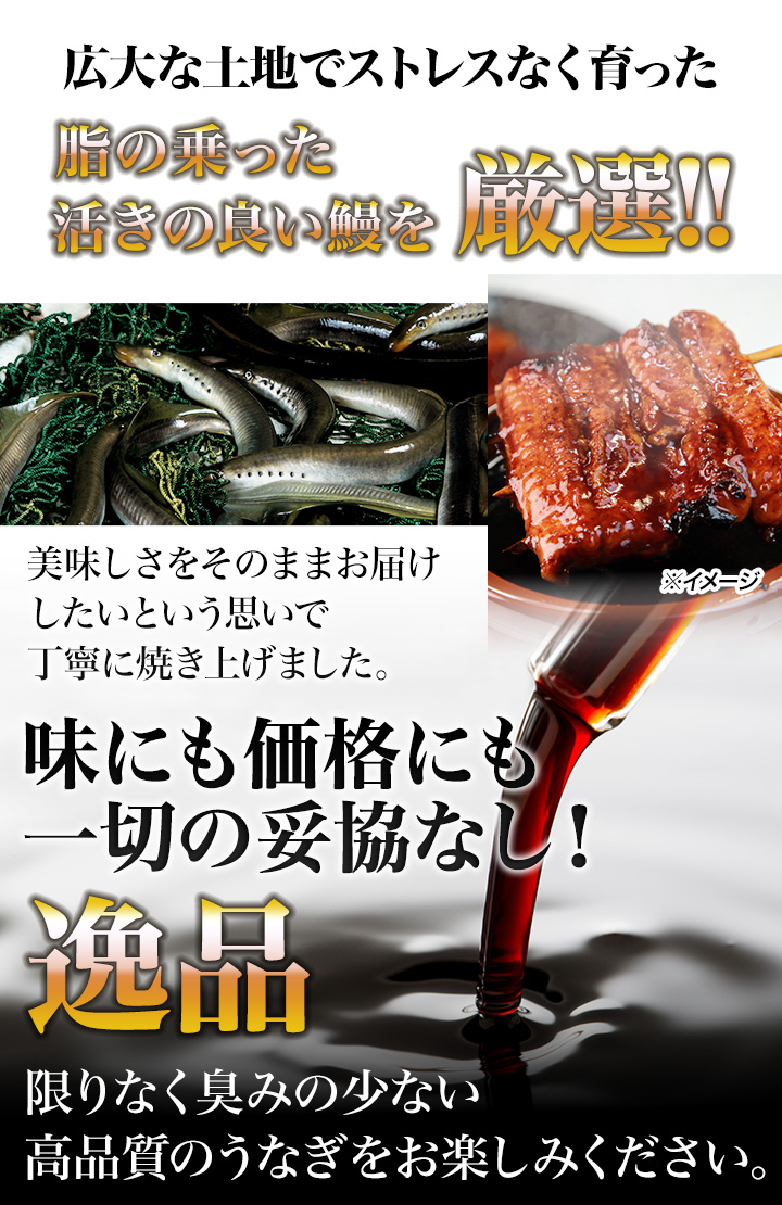 | 商品説明 | ストレスなく育てられた高品質のうなぎを、市場には少ないカットと刻みのセットに仕上げました。 白焼きした後に蒸しを入れ、タレ漬け・焼きを4回繰り返し、余分な脂を落としながら旨みをぎゅっと閉じ込め焼き上げています。 老舗メーカーの山椒付き特製タレと一緒にお召し上がりください。 |