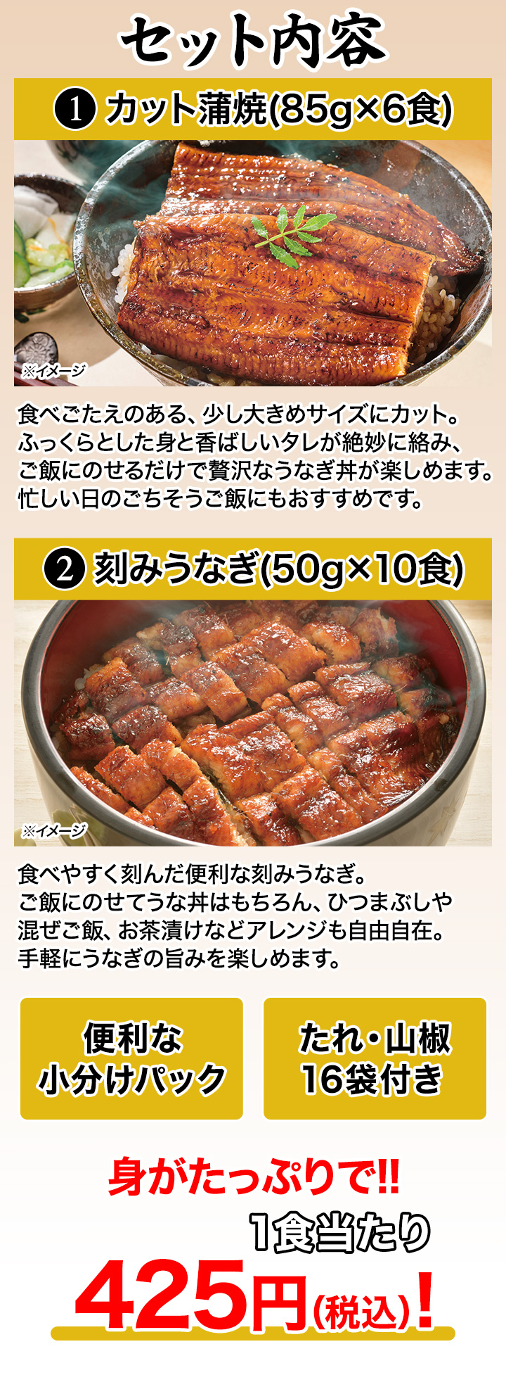 | セット内容 | ・鰻蒲焼カット(内容量85g)×6袋 ・刻み鰻(内容量50g)×10袋 ・たれ・山椒×16袋 ・食べ方説明書 |