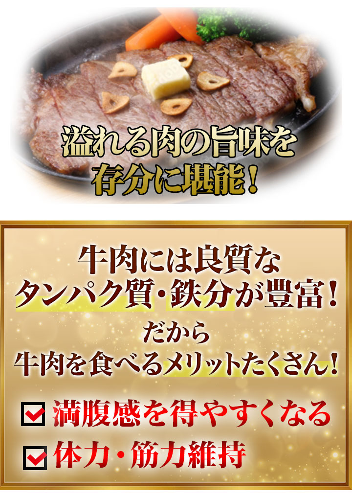 筋繊維が少ないので肉質は柔らかく、風味も豊かなのが特徴です。これぞ「ステーキの王様」と言った見た目と赤身の旨さが楽しみ尽くせる人気部位です。