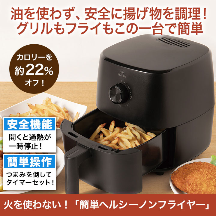 | 商品説明 | ”おいしい”をもっと手軽にヘルシーに。油を使わず、まるで揚げたて。 揚げ直しはもちろん、グリルやフライにも対応! これ一台で毎日の料理がグンと手軽になります。 熱風で食材を調理する「ノンフライポット 1.0L」。 油を使わないので、サクッとヘルシーに仕上がります。 ポットは丸洗いOK。シンプルな構造で、気になる油汚れもしっかり洗い流せます。 時間設定ダイヤル式。料理に合わせて時間を設定できるので誰でも簡単に美味しく調理できます。 |