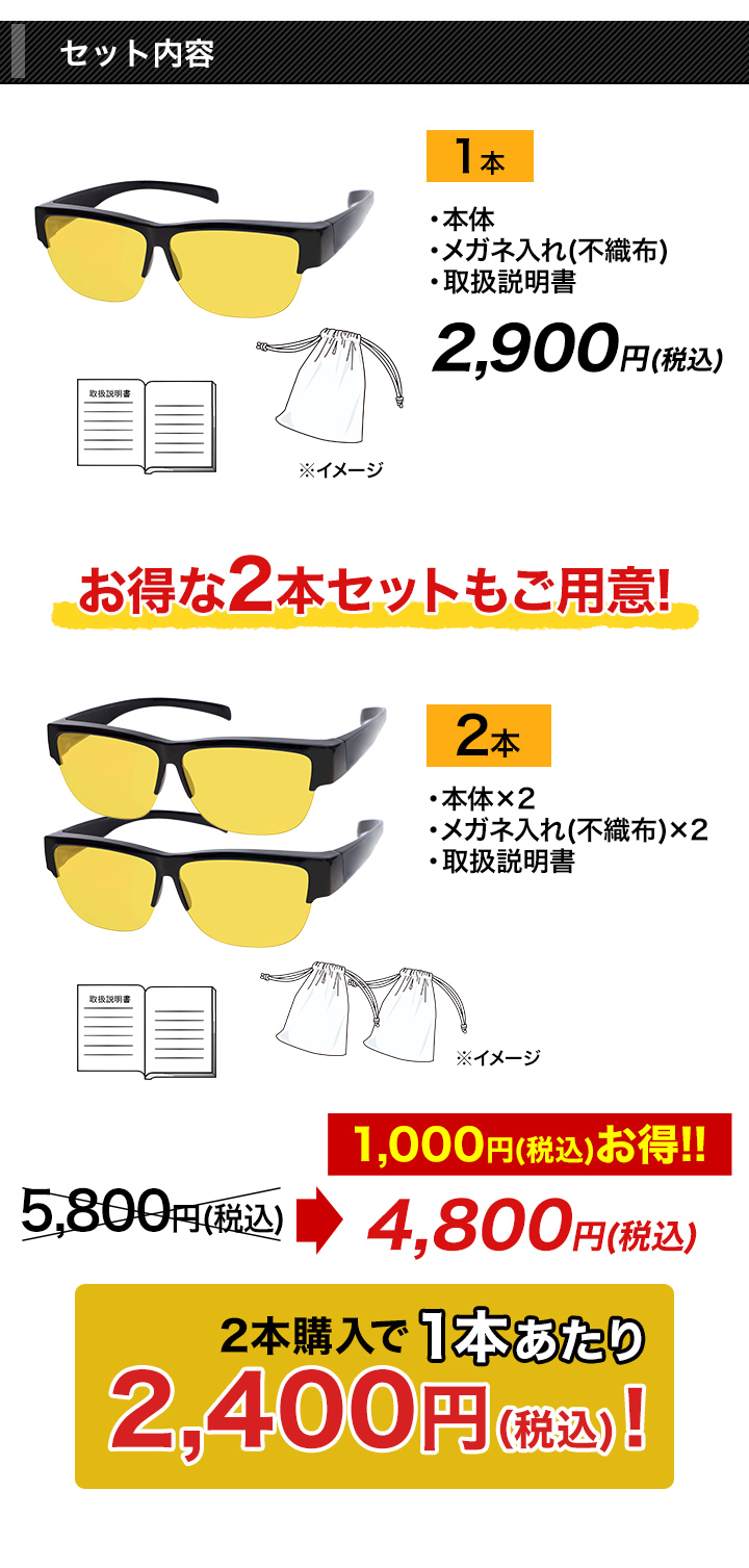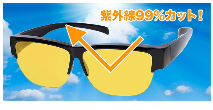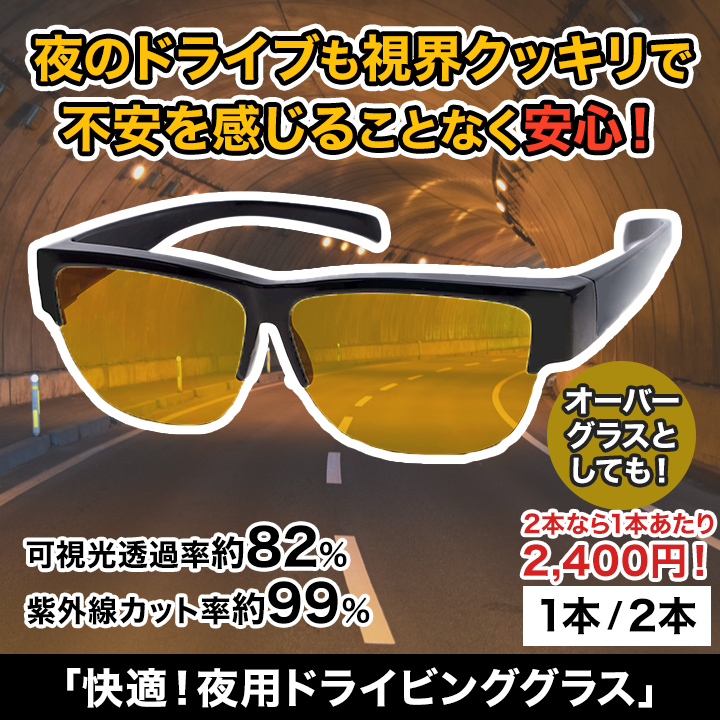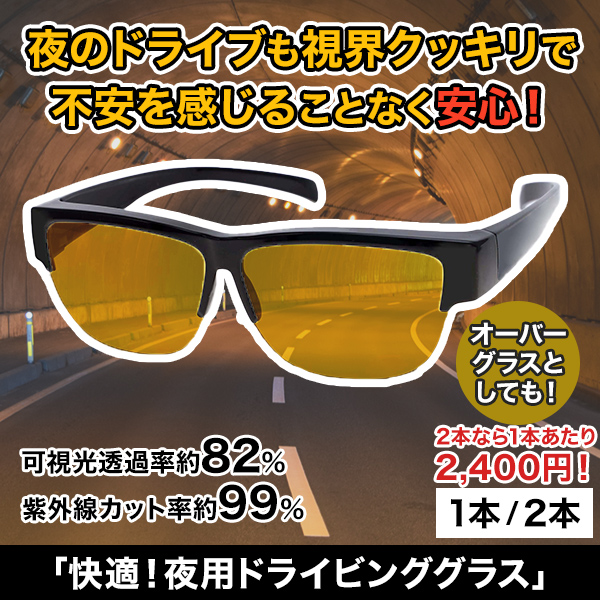 | 商品説明 | 夜のドライブも視界クッキリ!対向車の眩しいヘッドライトにも対応。眼鏡の上からかけられるドライビンググラス。