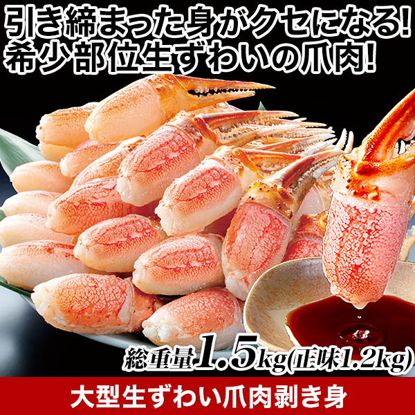| 商品説明 | 引き締まった身がクセになる!希少部位生ずわいの爪肉です。 カニはカニでも「カニ爪が好き」という方に断然おすすめ。 ガブリと頬張ると押し返してくるようなほどよい弾力があります。 |